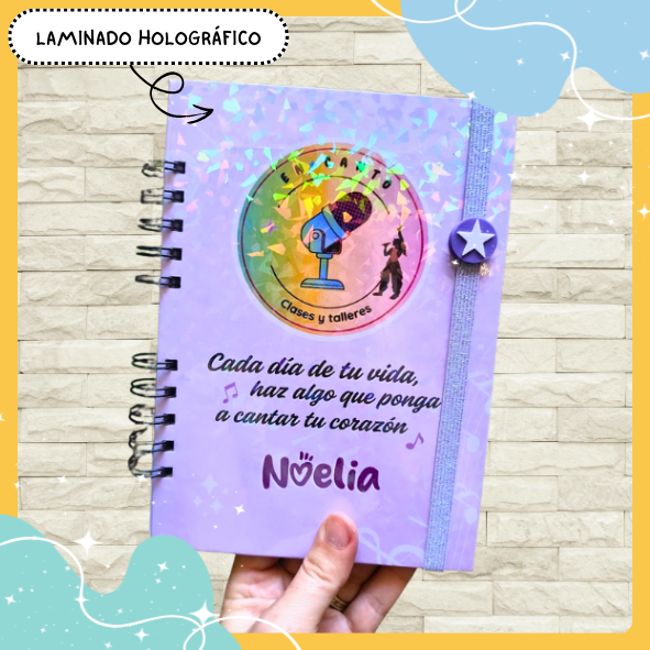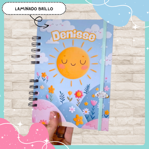 Cuaderno personalizado. Se puede elegir la temática de la tapa. Las tapas son duras, laminadas para mejor protección. Incluye elástico y dije (según stock disponible).